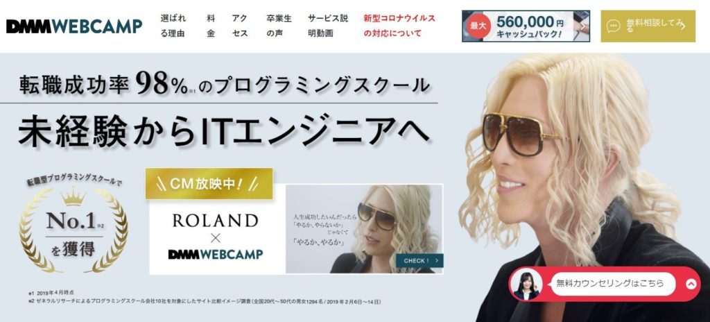 補助金制度あり、転職保証制度あり、返金保証制度ありとあらゆる面で条件がいいオンラインスクールとして有名なのがDMM WEBCAMP![]()