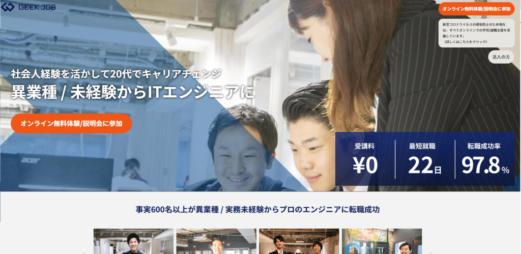 せっかくスクールに通うなら転職までサポートしてくれるスクールの方が良いという人にとってありがたいのがGEEK JOB![]()